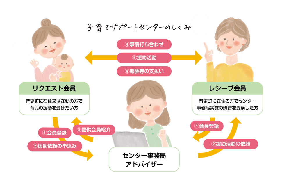 音更町から委託を受けているセンターがそれぞれの会員の橋渡し、コーディネートを行います。